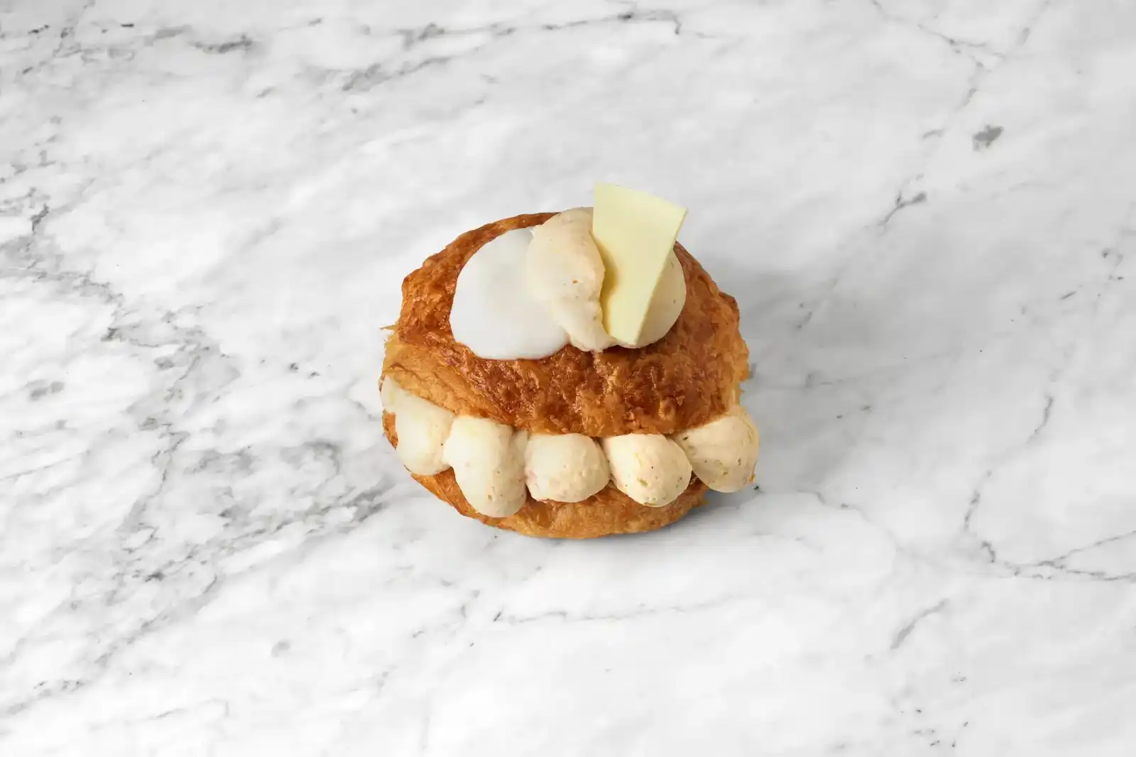 glasur og pyntet med et stykke hvid chokolade med tørret rabarber.