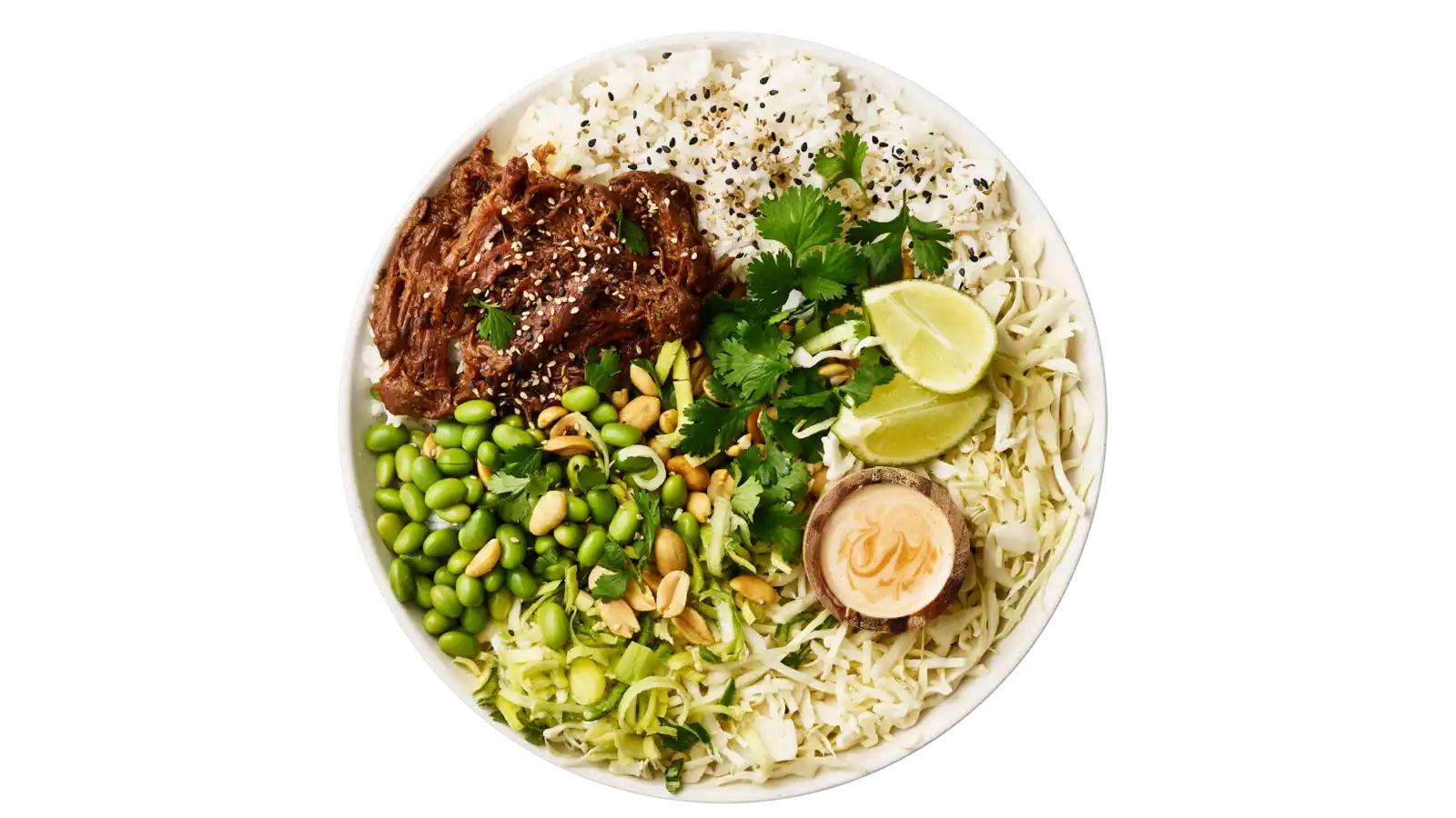 Varme ris, teriyaki beef, kål, edamame, porre, peanuts /Kimchidressing & gomadressing