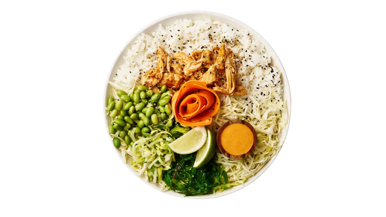 Varme ris, varm pulled chicken, kål, edamame, syltet gulerod, porre, tangsalat, lime & sesam / kimchidressing