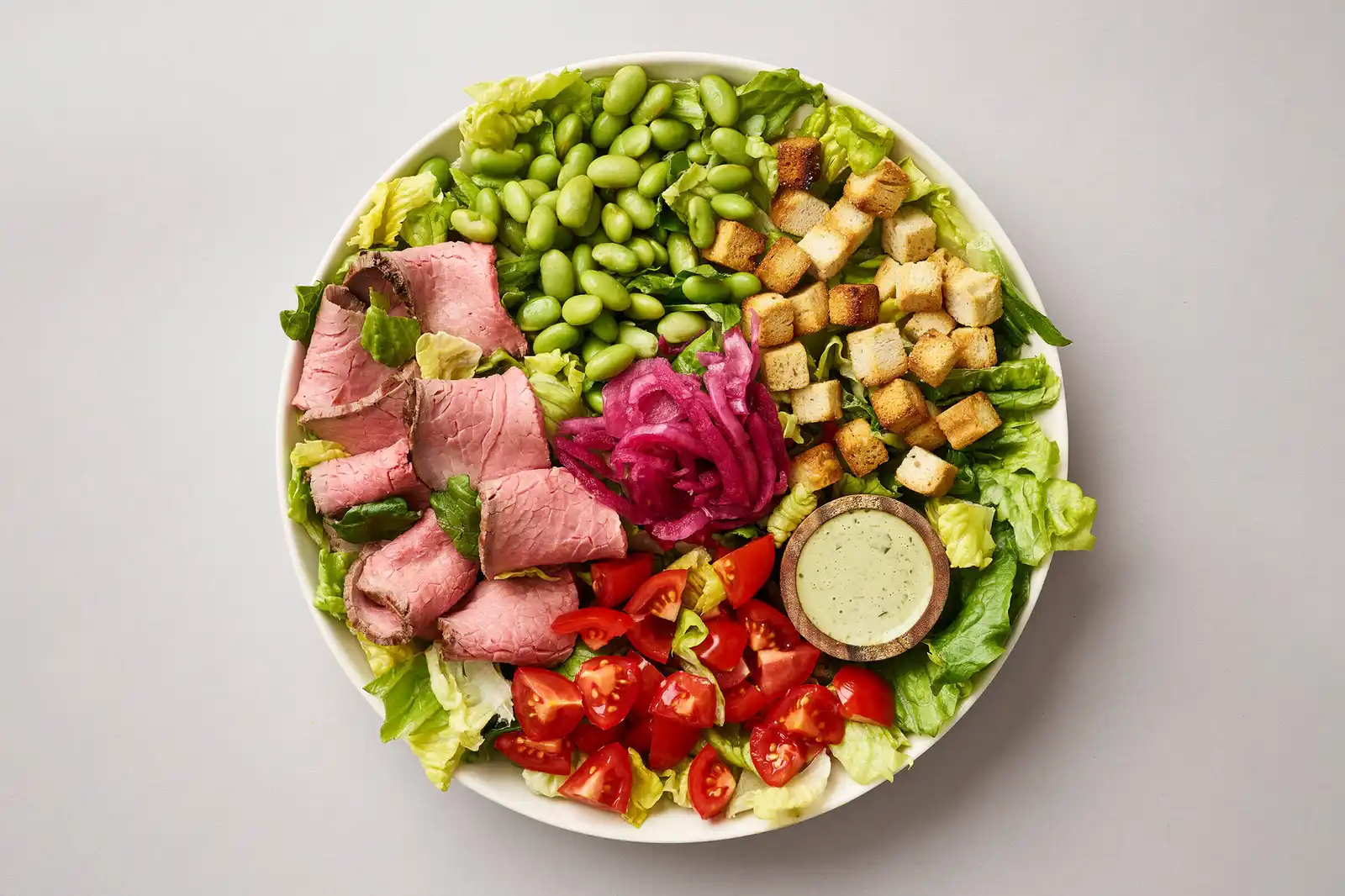 Romaine, okse, tomater, syltede rødløg, edamame bønner & croutoner/ Estragondressing