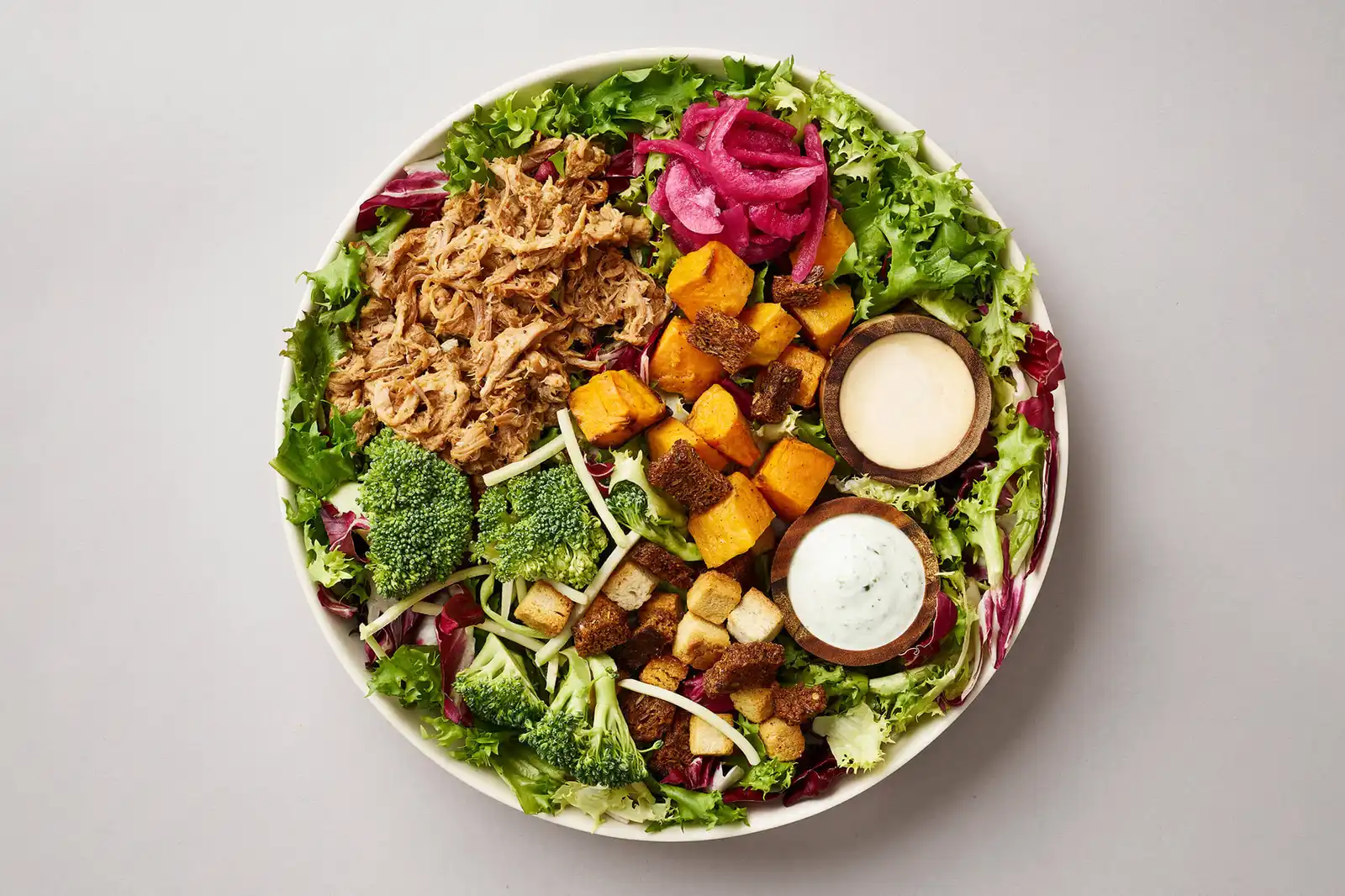 Salatmix, pulled pork, syltede rødløg,søde kartofler, broccoli & croutoner/ Chipotledressing & urtedressing