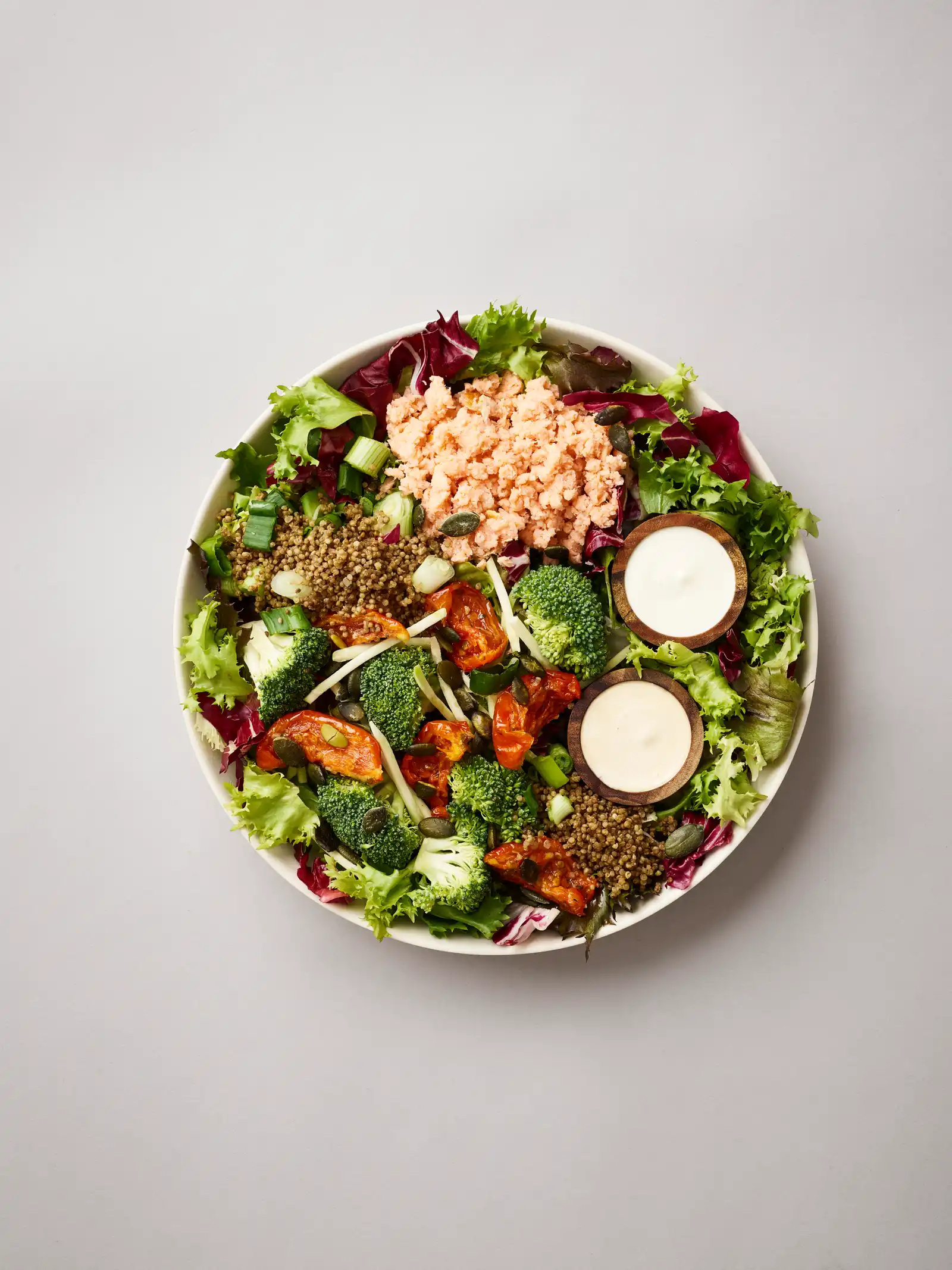 Quinoa & salatmix, varmrøget laks, broccoli, porre, semitørrede tomater & ristede græskarkerner/ Chipotledressing & fransk dressing