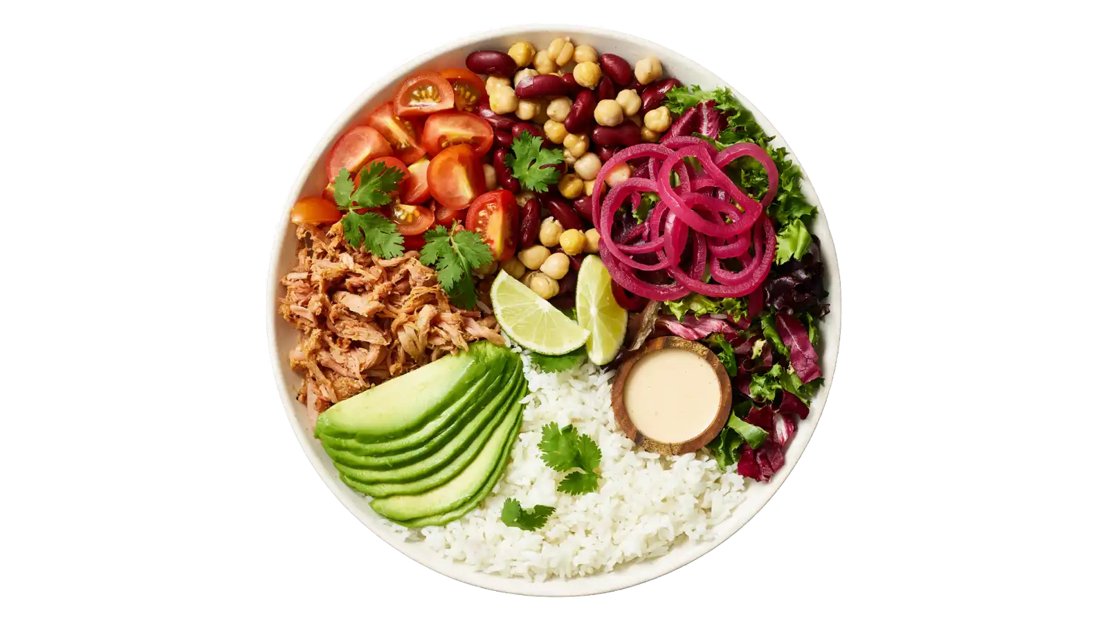 Lune ris, varm pulled pork eller chicken, salatmix, syltede rødløg, cherrytomater, bønnemix, avokado, frisk koriander & frisk lime/ Chipotledressing